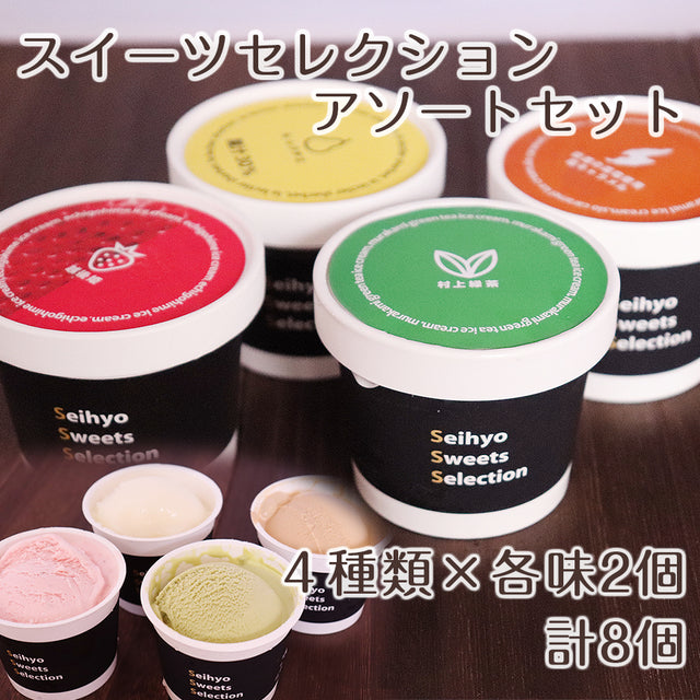 | 内容量 | 越後姫アイスクリーム120ml×2個 村上緑茶アイスクリーム120ml×2個 ルレクチェシャーベット120ml×2個 塩キャラメルアイスクリーム120ml×2個 |